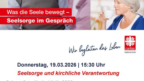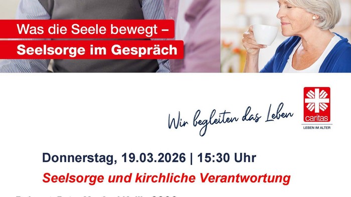 | Was die Seele bewegt - Seelsorge im Gespräch Pater Manfred Kollig spricht über Seelsorge als Auftrag der Kirche. Er thematisiert Verantwortung, Haltung und Präsenz in einer sich wandelnden Gesellschaft und zeigt auf, wie Seelsorge Menschen in unterschiedlichen Lebenslagen erreichen kann – auch jenseits klassischer kirchlicher Räume. Ort: Speisesaal im Caritas-Seniorenzentrum Kardinal Bengsch, Iburger Ufer 14, 1058 Berlin-Charlottenburg Referent: Pater Manfred Kollig SSCC Generalvikar, Erzbistum Berlin |